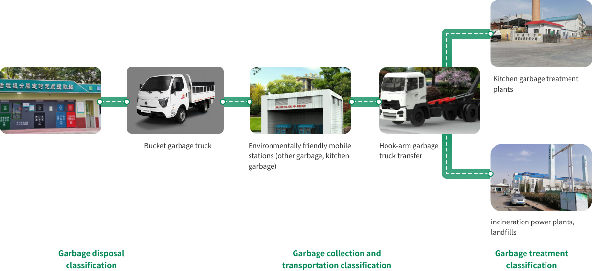 Garbage classification and transfer modes for narrow urban communities [Direct vehicle collection mode - suitable for communities with small populations and garbage volume that are located close to power plants (within 20km)], with existing vehicles used as other garbage collection vehicles